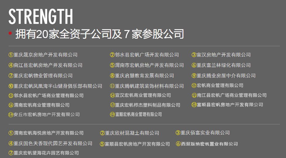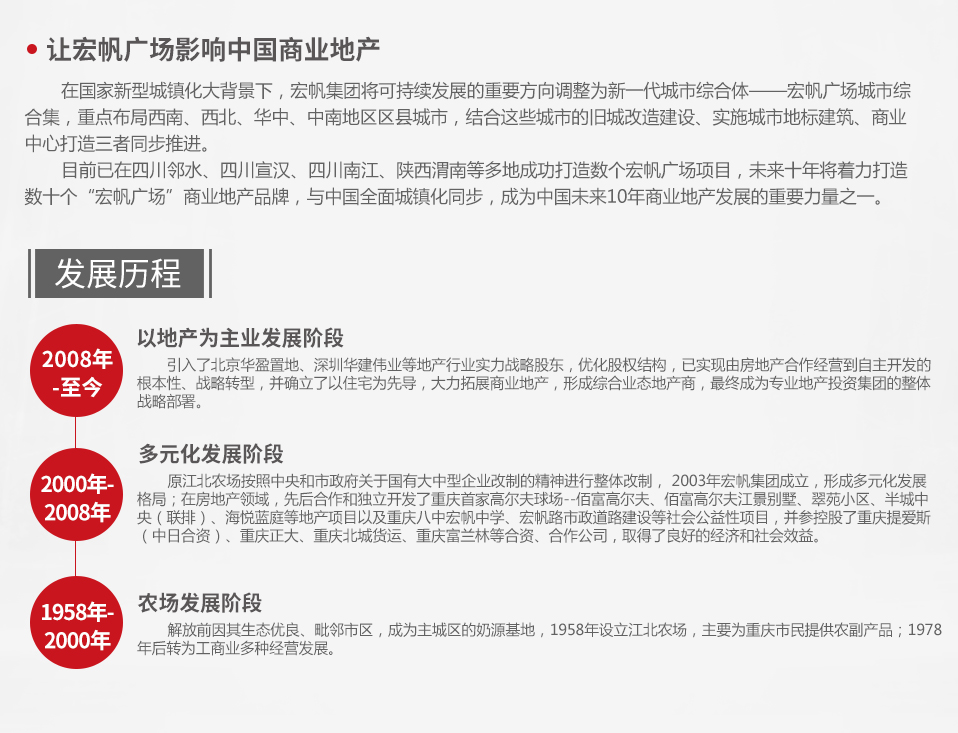 年創(chuàng)建于重慶 宏帆集團(tuán)于2003年6月由原重慶市江北農(nóng)場(chǎng)改制組建,并經(jīng)過(guò) 2006年10月和2008年9月兩次重大資產(chǎn)重組,現(xiàn)股東結(jié)構(gòu)為:重慶市農(nóng)業(yè)投資集團(tuán)有限公司持股34%、深圳世紀(jì)星瀚實(shí)業(yè)有限公司持股33%、深圳市華建偉業(yè)投資有限公司16.5%、深圳華盈盛世實(shí)業(yè)有限公司持股16.5%。注冊(cè)資本2億元,現(xiàn)有員工約1000名,總資產(chǎn)約65億元,總開(kāi)發(fā)面積超過(guò)400萬(wàn)平方米。宏帆集團(tuán)歷經(jīng)十多年來(lái)的持續(xù)、穩(wěn)健發(fā)展,現(xiàn)已發(fā)展成為集商業(yè)地產(chǎn)、住宅地產(chǎn)、生態(tài)旅游、酒店餐飲、商業(yè)管理、物業(yè)管理、教育產(chǎn)業(yè)、工程建設(shè)、景觀設(shè)計(jì)、綠化養(yǎng)護(hù)、高端休閑等于一體的大型集團(tuán)公司。
